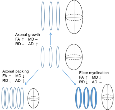 Fig 1, Changes of FA, MD, RD, and AD caused by axonal growth, axonal packing and fiber myelination.