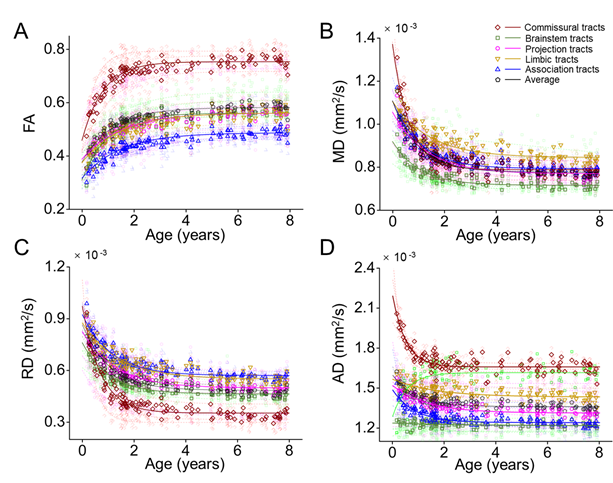Fig. 5, FA of white matter tracts increased, MD, RD, and AD of white matter tracts decreased during development. The tendencies of the changes of the DTI metrics by ages are exponential. The developmental rates of white matter tracts are differential.