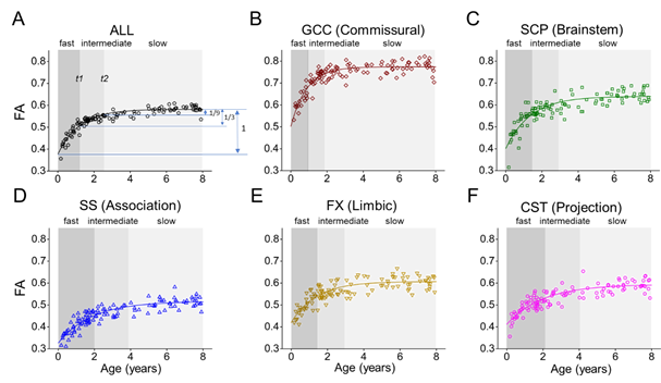 On December 23, 2019, a paper entitled “Differential White Matter Maturation from Birth to 8 Years of Age” was online published in Cerebral Cortex by Prof.Fang Fang’s group at the School of Psychological and Cognitive Sciences at Peking University, Peking-Tsinghua Center for Life Sciences and the PKU-IDG/McGovern Institute for Brain Research, and Prof.Hao Huang’s group at the University of Pennsylvania. This study acquired diffusion tensor imaging data from 118 typically developing children aged 0 to 8 years and 31 children with autism aged 2 to 7 years. Modelling with exponential function, the maturation of white matter was found spatially and temporally differential. The white matter maturation was further separated into fast, intermediate, and slow phase according to the developmental rate. This study provides a standard development reference, which can serve as a biomarker for early detection of neuropsychiatric disorders.
