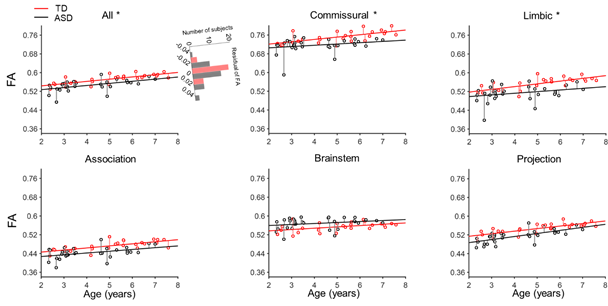 Fig. 9, The residual variance of the FA of children with autism (black) was found significantly larger than the residual variance of TD children (red) in the commissural, limbic, and entire white matter.