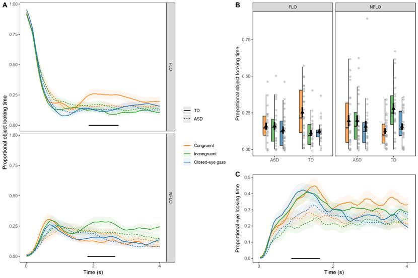 Fig. 2. Results of the eye- and object-looking time. Time-course of proportional object-looking time (A) and eye-looking time (C). Time series signals of proportional AOI-looking time were created by calculating the proportional trial towards a particular AOI relative to the total number of valid trials for each data point. Multiple comparisons were corrected by using a cluster-based permutation test. The black horizontal line illustrates the cluster of time when the Condition x Group interaction effect (A) or Group main effect (C) is significant. The shaded area indicates standard errors. Time zero is the start of the face’s gaze shifting. (B) Boxplot of object-looking time during significant time periods revealing interaction effect in Fig 2A, with each triangle representing mean value, each thick black vertical line representing error bar, and each point representing one child.