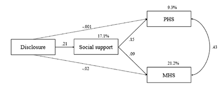 HIV/AIDS infection has significant negative effects on the mental and physical health of infected individuals. Improving health-related quality of life can help infected individuals better cope with their disease. HIV disclosure was assumed an essential step for PLWH to create an opportunity of receiving social support from significant others. Besides, as a coping strategy, acquiring social support was an essential buffer against the negative impact of disclosure concern on H-QoL outcomes. However, existing studies have yielded inconsistent findings on the relationship between HIV disclosure and physical/mental H-QoL. Also, little is known about the mechanisms influencing HIV disclosure in specific relationships (e.g., to family members).