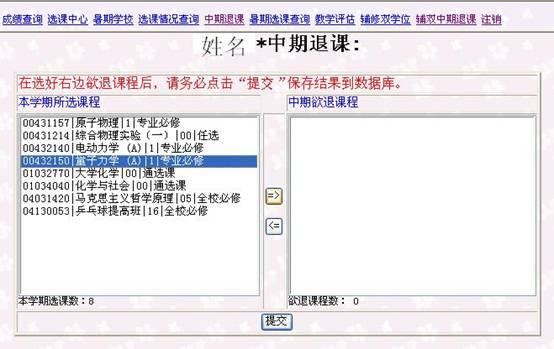 4.在选择完毕右边欲退课程之后,务必点击“提交”按钮确定,这样欲退课程才会保存到退课申请数据库。