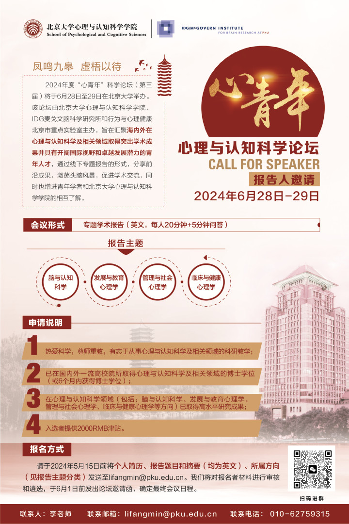 请于2024年5月15日前将个人简历、报告题目和摘要(均为英文)、所属方向(脑与认知科学、发展与教育心理学、管理与社会心理学、临床与健康心理学)发送至lifangmin@pku.edu.cn。我们将对报名者材料进行审核和遴选,6月1日前发出论坛邀请函,确定最终会议日程。