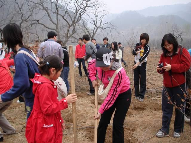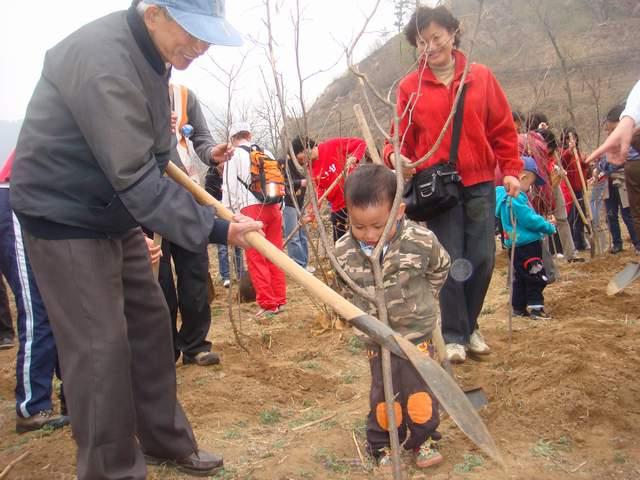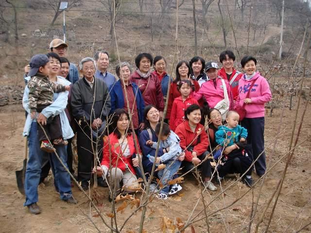 虽然伴着蒙蒙的春雨,但是大家的心情却格外的舒畅。到达怀柔县黄花城乡后,大家步行到植树的地点,每两个人一组,一共种下了10棵树苗。80高龄的沈德灿老师也参加了植树活动,与2岁的吕安卓小朋友一同种下了一颗树苗。