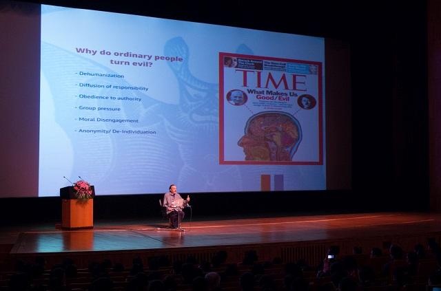 津巴多教授发表了题为《从恶魔到英雄之路》的精彩演讲。津巴多教授从他的幼年生活环境开始讲起,展示了环境对人们表现出不良行为的重要影响作用。津巴多教授剖析了邪恶行为的类型和由来,包括个体、情境、系统三种类型,其中权力的滥用是造成人际间伤害的重要原因之一。津巴多教授和大家一起回顾了他1971年主持的斯坦福监狱实验,在实验中,扮演狱警的被试由于身份的设定不自觉对扮演囚犯的被试表现出冷酷甚至残忍的虐待行为,以至实验仅进行六天便提前终止。这不仅是一项用严格的实验方法论证情境对人类行为影响的心理学实验,也让人们重新开始思考善意与恶行的影响因素。津巴多教授在这个实验之后受到启发,认为人们不仅会由于服从权威,受到情境的影响而推卸责任、伤害他人,也会由于自身的正义表现出勇敢的英雄主义行为。2011年美国《Science》杂志特别发表文章纪念这个著名的实验。在此后的研究中,津巴多教授开始关注如何激发每个人内心的英雄,克服消极与羞怯,创建更加美好的世界。这个问题的研究对于消除电子信息时代愈加冷漠的人际关系有着重要的意义。现在,津巴多教授的一系列研究成果正在全世界各地推广开来。从“恶魔”到“英雄”,津巴多教授不仅做出了卓越的学术贡献,也展现了一个心理学家对于人类生存与社会发展应当承担的责任。