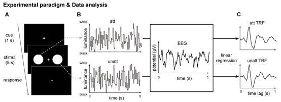 本研究中,罗欢课题组采用了视觉注意范式结合时间响应函数(temporal response function) 的方法从人类大脑的整体脑电活动中分离出多个物体各自的神经响应活动(图1)。实验发现即使当前任务只要求注意一个视觉物体时,注意采样却仍然以大约200-300 毫秒的节奏在两个物体间进行切换,即反映出一种序列加工模式;这一序列加工过程是通过对alpha频段(~10 Hz)的神经活动进行时空上的调控来实现的;这种序列加工模式会随当前任务所要求的注意分配而进行相应改变,当任务要求在多个物体上的注意分配更均匀时,序列采样模式变得更为明显。