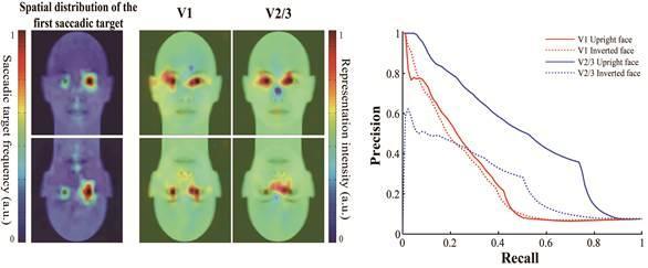 探究注意优先图的神经机制的关键在于检验刺激在视觉系统中的拓扑表征与知觉行为模式之间的一致性。然而,自然刺激的神经表征往往较为复杂,而且用传统心理物理学指标刻画加工自然刺激的知觉行为模式难度较大。为了解决这些问题,方方课题组要求被试针对三种类型的面孔刺激图片(正立面孔、倒立面孔、相位打乱面孔)进行一个简单的图片匹配任务,即判断当前图片是否与上一张相同(图1)。 研究人员基于Dumoulin和Wandell所提出的群感受野模型重构了面孔刺激的拓扑表征,以任务中刺激出现后首次眼跳的落点位置刻画了加工面孔刺激的知觉行为模式,并通过计算Precision-Recall曲线下面积(area under curve)来量化刺激拓扑表征与首次眼跳落点模式的一致性(图2)。研究发现,面孔刺激在早期视觉皮层(V1、V2/3)的拓扑表征与首次眼跳落点模式具有高度一致性,说明早期视觉皮层形成了面孔刺激的注意优先图。在V1中,正立面孔和倒立面孔的拓扑表征与首次眼跳落点模式的一致性程度没有显著差异,说明初级视觉皮层的注意优先图受刺激图像的空间结构影响较小,很可能是因为其神经活动主要编码刺激的物理属性(Zhang 等, 2012)。然而,在V2/3中,正立面孔表征与首次眼跳落点模式的一致性显著高于倒立面孔,说明纹外视觉皮层形成的注意优先图受到刺激图像的空间结构的影响。本研究不仅率先揭示了自然刺激注意优先图在早期视觉皮层的神经机制,同时还首次揭示了除物理特异性和任务相关性以外,影响注意优先图的另一关键性因素-刺激图像的空间结构,为注意优先图理论做出了重要拓展和补充。