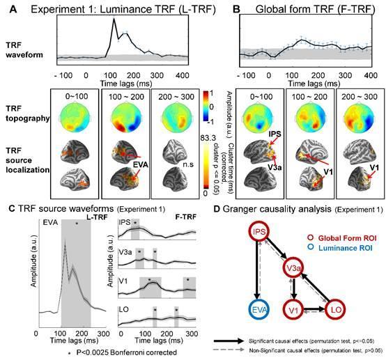 知觉整合,作为人类视觉系统的一个基本和重要的能力,能快速从环境中将离散和模糊的碎片整合为一个有结构的整体。之前的研究表明知觉整合依赖于多个脑区之间的反馈调控,但是该反馈调控的来源,以及知觉整合加工的具体神经时空动态模式仍不清楚。在本研究中,我们使用具有毫秒级的高时间分辨率和较高空间分辨率的脑磁图(MEG)技术,结合一种我们最近使用的追踪神经时间响应函数(TRF)的新方法 ([1][2]) 在人类受试上来探索知觉整合过程的神经时空动态模式。