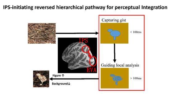 罗欢研究员课题组发现,知觉整合起源于视觉背侧通路的顶叶区域(具体来说这里发现的是IPS)的早期快速激活,之后沿着视觉背侧通路反向依次调节低级脑区(图1)。这一结果表明:知觉整合过程利用了背侧视觉通路的快速特性,首先快速抽取了视觉刺激的整体(gist)信息,然后根据这个粗略的整体信息逐级返回到初级视皮层进而对局部细节加工进行指导和调整(图2)。这一“从整体到局部”的反向层级加工过程和认知心理学以往的整体优先性发现一致,同时,本研究发现的背侧视觉通路参与其中又提供了新的神经证据和机理支持。