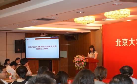 心理学系10级本科生金悦宁的母亲肖薇女士作为家长代表致辞。她祝贺了心理系同学们的成长,感谢心理系对员工们的培养,希望同学们常怀感恩之心,勇于担当责任,注重健康,取得更好发展。