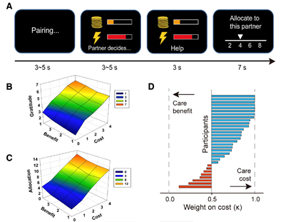 图1.(A)人际互动范式。(B)行为实验结果。被试感激情绪评分和回馈行为均与自己的获益和施惠者的代价正相关。(C)行为实验结果。对于不同被试而言,自己的收益和施惠者的代价对其感激情绪的影响程度不同。