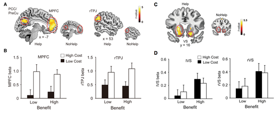 图2.(A - B)施惠者的代价的加工主要涉及心理理论相关的脑区(颞顶联合区TPJ、背内额前额叶dmPFC)。(C - D)受惠者自己的获益加工主要涉及价值表征相关的脑区(腹侧纹状体VS)。