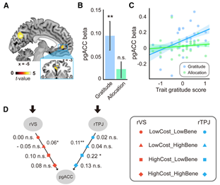 图3.(A - C)感激情绪在pgACC进行表征,其表征强度与个体的感激特质得分正相关。(D)动态因果模型分析显示,VS和TPJ的信息最终整合到pgACC,表明pgACC在感激情绪整合中的重要作用。