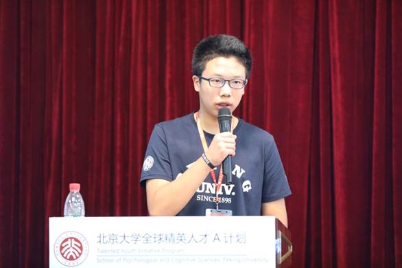 然后,来自上海市复旦大学附属中学的郭轩同学作为营员代表,回忆了他参加“北大A计划”选拔的心路历程,参加选拔的过程虽然辛苦,但也使他对自身有了更深的思考。郭轩同学引用了杜甫的诗词:“夔府孤城落日斜,每依北斗望京华。”来表达他对于“北大A计划”的期待与热爱。