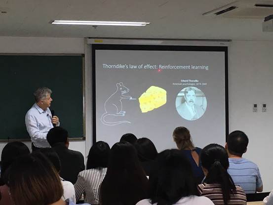 9月11日下午1时,首场讲座“奖励、预期和大脑多巴胺”(Reward, prediction and brain dopamine )在TapTap点点王克桢楼1113会议室举行。韩世辉教授首先对Ray Dolan教授的来访表示热烈欢迎,并对教授进行了简要介绍。Ray Dolan教授在讲座中全面系统地介绍了大脑奖励机制和学习的研究成果和发展方向。通过对其实验室的工作总结,描述了计算神经病学结合脑功能成像、特别相关的计算模型,指出了奖赏估计误差的神经基础和重要性,使其对人类学习和计划有关的问题变得更加明朗;最后还讨论了多巴胺对学习的影响,实现了计算神经病学在理解人类精神和行为方面的系统研究。