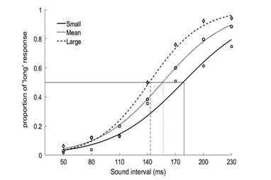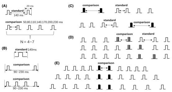 具体而言,实验1显示,相比于单独呈现的空间隔(140 ms),声音序列中同等物理时长的ISI(inter-stimulus interval)会被知觉为时长更短。实验2对经典的FII进行了验证,发现实时距相比于具有相同物理时长的空时距,被知觉为更长。实验3显示,在一个声音序列中,对单个空时距的知觉没有出现时间位置效应,即与该空时距在序列中的出现顺序无关。在实验4中,观察到很强的时间压缩效应,目标空间隔(由两个奇异音组成)被认为比声音序列中的其它物理上等长的时间间隔更短。在实验5中,通过呈现三种不同的任务无关的声音间隔背景来揭示时间间隔的同化效应。其中,任务无关声音序列的平均ISI小于、等于或大于目标时间间隔(目标间隔嵌入该声音序列)。结果显示,当目标间隔所在的背景声音序列的平均ISI较小时,奇异音形成的目标间隔也会被知觉得较小;反之,当目标间隔所在的背景声音序列的平均ISI较大时,目标间隔则会被知觉得较长。上述发现可以在贝叶斯推理框架下进行解释:人类观察者会利用动态更新的背景情境信息,来指导对于目标时间间隔的时间加工,从而应对日常生活中时间信息的不确定性。