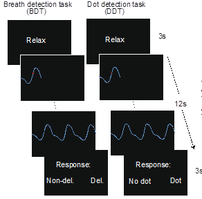 图1.实验任务流程。BDT任务中,被试需要将注意指向自己的呼吸,判断所呈现的呼吸曲线与自己的实际呼吸节律相比是同步的还是延时的。DDT任务中,被试需要将注意指向外部视觉信号,判断呼吸曲线上是否出现过红点闪烁。