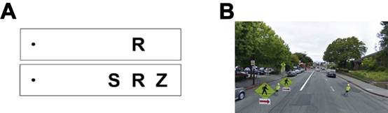 图1 视觉拥挤效应示意图。 A)字母识别的视觉拥挤效应。左边的小黑点是被试的注视点,当在被试的外周视野呈现单独的目标(target)字母“R”时,被试能够很容易地识别出目标字母(图片上半部分);但当在目标字母的两侧增加两个无关的旁侧(flanker)字母时,对目标字母“R”的识别会变得很困难(图片下半部分)。B)自然场景中的视觉拥挤效应。当盯着场景中央的靶心时,由于马路左边的小孩附近有标识物,我们很难或者说不可能识别出马路左边的这个小孩,但是我们很容易识别出马路右边的小孩。