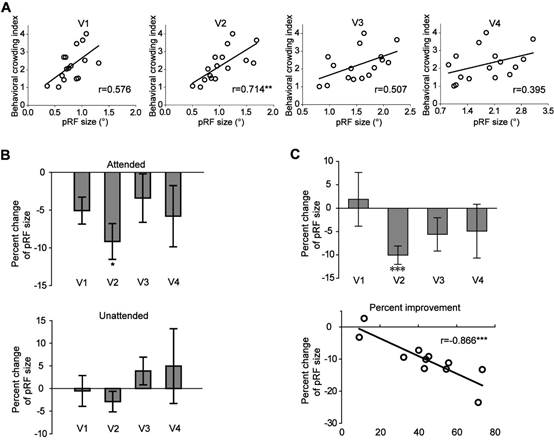 图2 实验结果。A)实验一的结果。横坐标是目标体素的群感受野大小,纵坐标是视觉拥挤强度的指标。B)实验二的结果。上、下两张图分别表示注意条件和非注意条件下的结果。纵坐标是目标体素的群感受野大小在两种视觉拥挤强度条件下的变化指标。C)实验三的结果。上面的图表示知觉学习前、后目标体素的群感受野大小的变化。下面的图表示在知觉学习前、后V2内目标体素的群感受野大小的变化与拥挤效应强度的变化之间的相关。