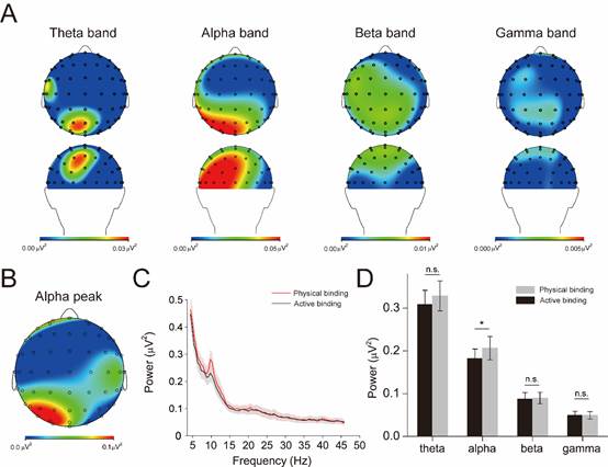 图3 脑电(EEG)实验结果。(A)不同频段的脑电信号地形图以及(B)alpha振荡峰值对应的信号的地形图。 (C)和(D)脑电信号在特征正确绑定与主动绑定两种状态间的能量差异体现在alpha频段,而其他频段并无显著差别。