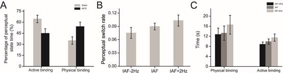 图4 经颅交流电刺激(tACS)实验结果。(A)施加与个体alpha振荡峰值相同频率的交流电刺激改变个体的alpha振荡强度,随之被试知觉到与刺激的物理属性相同的颜色-运动正确绑定的时间增加。(B) 施加IAF-2Hz,IAF, IAF+2Hz的交流电刺激,被试在两种知觉状态之间的切换频率也随之变化,以及(C)这种改变对于主动绑定状态的影响更大。