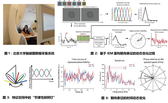 解决这一问题的关键是在人脑神经活动中标记和追踪注意过程中每个目标特征的神经表征的动态变化过程,而前人研究中的技术范式却难以做到这点。功能磁共振成像虽然具有高空间分辨率,但时间分辨率较低,无法捕捉神经活动的动态过程。而脑电图虽然有高时间分辨率,但空间分辨率较低,无法精确刻画神经活动的空间模式。此外,对人脑活动的非侵入式记录往往反映了成千上万神经元的协同活动,因此还需要基于计算模型对每个特征的神经表征信息进行还原。为此,研究团队采用了同时具有较高时间和空间分辨率的脑磁图(MEG)技术记录人类同时注意多个视觉特征的大脑活动(图1),并创新性通过逆向编码模型(Inverted Encoding Model, IEM),在毫秒级别上重构了各个注意目标特征表征的动态变化过程。IEM将脑磁图信号分解为一系列朝向信息通道(orientation information channel)响应的线性和,并通过估计各通道的线性权重,还原信息通道的响应(图2)。在实验过程中,被试同时注意两个朝向(45度和135度)。与此同时,研究团队逐时间点还原各信息通道的瞬时响应并进行分析。结果发现,大脑并没有将注意资源在两个目标特征之间并行分配,而是以每200-300ms的速度在多个特征间进行交替切换。这表明在同时注意多个特征的过程中,大脑采用了一种超越了物理空间的“节律性探照灯”,在特征维度空间中交替对各个目标特征进行增强(图3-4)。研究团队进一步在行为层面上验证了这种节律性的特征注意模式,并建立了相应计算神经模型。结果表明,这种多特征间的节奏性交替增强可能来源于神经元群体之间的局部竞争,而不是全局范围的反馈调制。这些研究结果从行为、神经和计算模型多个角度一致系统地揭示了多特征注意加工的神经机制,首次发现了特征空间中的“节律性探照灯”,填补了该领域的空白,也为类脑人工智能提供了来自于人脑启发的动态信息组织原则。