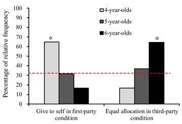 本研究探讨了这一效应在儿童早期的发生发展以及背后的心理机制。研究以4-6岁儿童为研究对象,设置了两个实验条件:儿童是作为当事人还是旁观者进行分配。在儿童作为当事人的实验条件下,研究者让儿童完成一个游戏后告诉他:“刚刚你和另一个小朋友都完成了相同的游戏,你们表现得一样好!老师现在想要奖励给你和他一些铃铛(5个)作为奖励。你看,你1个,他1个;你1个,他1个。诶,现在还剩下1个铃铛,你觉得是给他,给你自己,还是谁都不给呢?如果你选择谁都不给,那么老师就把它放到柜子里,只是放到柜子里铃铛就会生锈,就不可以玩了。”而在儿童作为旁观者的实验条件下,研究者则直接请求儿童帮忙给2个小朋友分配5个铃铛奖励。