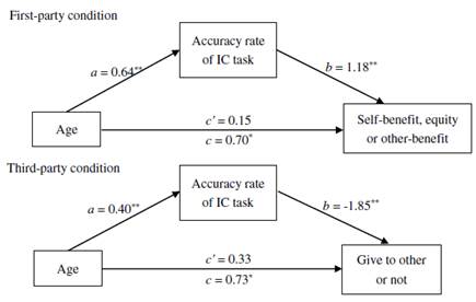 图2 不同条件下抑制控制中介了年龄对分配行为的作用