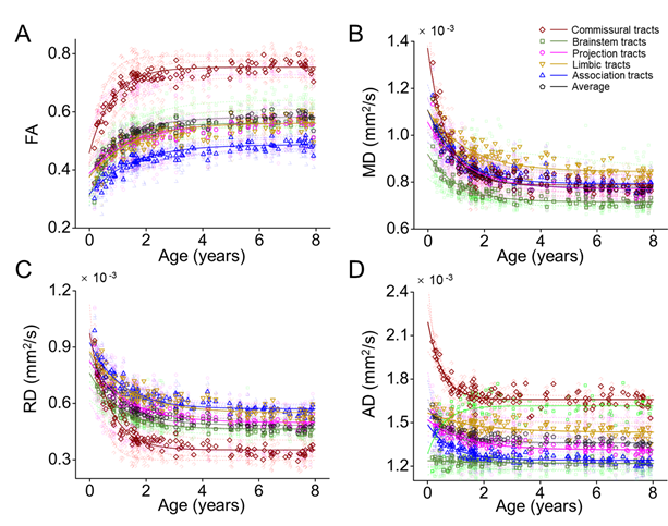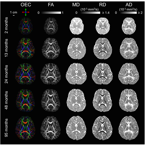 人类大脑白质在婴儿和儿童阶段经历了急剧的微观结构变化,包括轴突的发育和髓鞘化过程。白质的发育为记忆、注意、智力、语言、运动学习、音乐熟练度、认知控制等功能形成提供神经环路基础。白质的发育异常与精神分裂、抑郁症、双向情感障碍、孤独症、注意力缺陷多动障碍等神经精神疾病联系紧密。因此,描绘正常白质微观结构的发育过程不仅可以揭示不同神经环路的形成过程,也可作为参照系用于探测神经精神疾病患者大脑白质的异常发育。