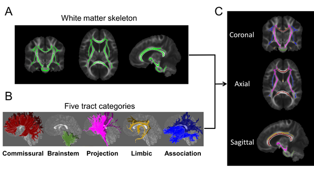 图3,将所有被试的FA像对齐到模板,提取白质主干(A),再通过图谱将白质分割成不同的白质束 (B & C)。