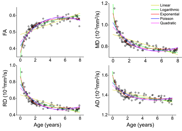 为了找到描绘0到8岁白质发育的最优模型,我们将五个备选模型:线性,对数,指数,泊松和二次多项式模型分别对118位被试的全脑FA,MD,RD和AD进行拟合(图4)。结果发现指数模型对四种DTI指标的拟合度都为五种模型中最高(均大于76.8%)。并且AIC分析发现指数模型为最优模型的概率大于99%。本研究随后即采用指数模型描述白质发育。