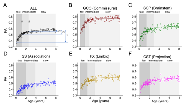 图6,白质束发育的三个阶段:快速,中速和慢速阶段。