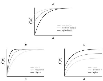 图7,指数函数f(x)=a·e-bx+c的三个参数a,b,c分别调控发育的幅度,成熟的快慢和发育后的成熟程度。