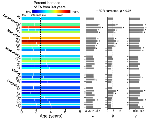图8,白质发育可分为快速,中速和慢速三个阶段。不同白质束三个阶段的时长不同。白质束发育过程可以被指数函数f(x)=a·e-bx+c的三个参数a,b和c量化。a的绝对值反映发育的幅度。b反映白质束成熟时间点的早晚。c反映白质束发育后的成熟程度。