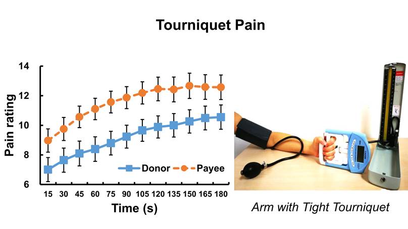 首先在雅安地震的现场研究中观察到了献血志愿者中利他行为缓解疼痛的现象,献血者主观感知到的抽血疼痛程度显著低于体检者。随后,研究者发现,自愿利他(为打工子弟无偿修订一份阅读材料)的被试相比于选择不利他或不知道修订阅读材料是出于助人目的的被试在冷压疼痛范式中报告的疼痛水平更低,在冰水中坚持的时间也更长。接下来的一个实验研究采用止血带范式模拟由缺血造成的疼痛。被试共完成两次止血带测试,中途休息时被要求填写一份调查问卷。一半随机分配的被试得知通过填问卷他们为地震灾区赢得了10元的捐赠,并亲手将钱放入捐赠箱里(利他组);另一半被试则得知他们为自己挣得了10元额外奖励(控制组)。也就是说,所有被试的行为完全一样,区别只在于行为的含义。结果发现,利他组被试在第二次止血带测试中感受到的疼痛水平显著低于控制组,表明为灾区捐钱对疼痛有缓解作用(图1)。