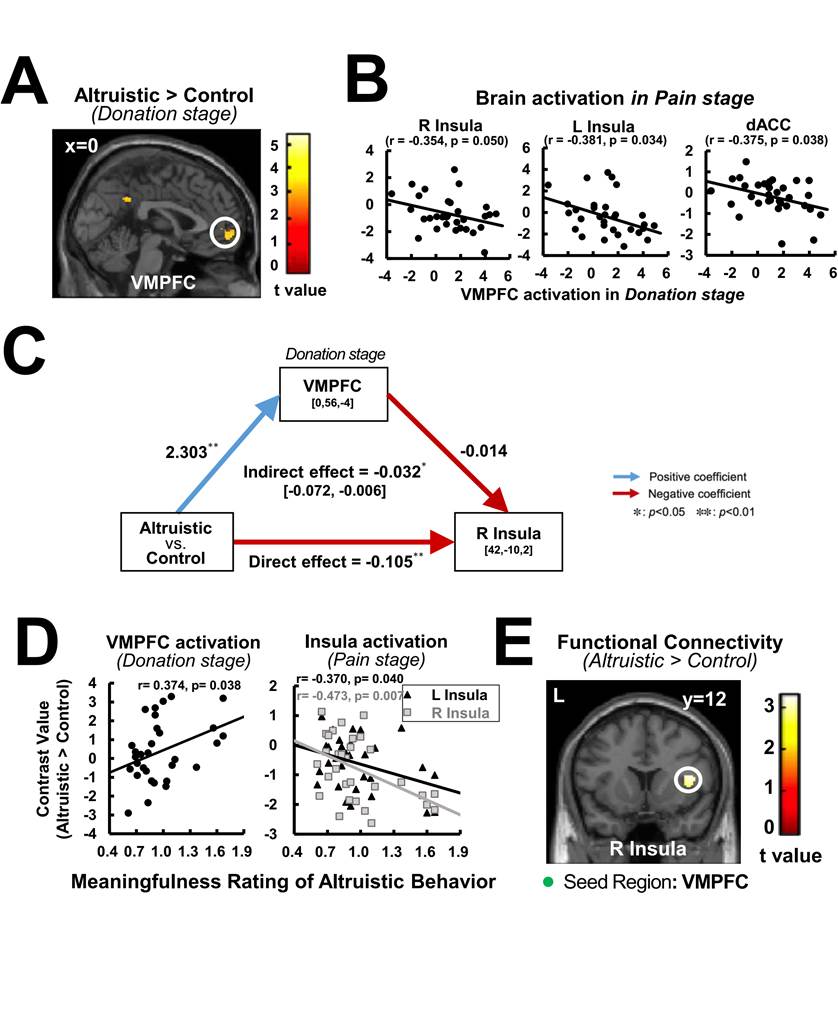本研究进一步探索了利他缓解疼痛的神经机制。被试得知在磁共振成像仪中进行两个不相关的实验。每个试次中,首先做一次利他或控制选择,随后在右手背上接受一次强度不等的电击,通过按键来报告自己的疼痛程度。利他选择为决定是否通过自己付出一些成本来为孤儿赢得较高的捐款,控制选择为判断两行图形的性质是否一致。结果发现,相比于控制选择,当做利他选择时,被试腹内侧前额叶(vmPFC)的神经活动显著增强,而与疼痛加工相关的脑区活动(如前扣带皮层和双侧脑岛)则显著减弱了,从神经活动层面证实了疼痛的降低。vmPFC与意义感的体验密切相关,vmPFC激活程度在利他行为与疼痛脑区激活程度的关系中起到中介作用,这表明被试从利他行为中所获得的意义感起到缓解疼痛的作用(图2-4)。