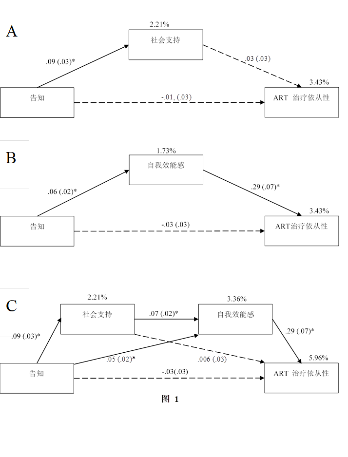 ART通过三种或三种以上的抗病毒药物联合使用来治疗艾滋病(AIDS),俗称“鸡尾酒疗法”。该疗法可以抑制HIV病毒复制,降低感染者血液中的病毒载荷,并有效预防病毒的进一步传播,最终降低与AIDS相关的发病率和死亡率。临床试验表明,达到上述治疗效果的前提条件是ART最佳依从性应大于等于规定剂量的95%。虽然艾滋病治疗免费政策已在我国开展十余年,但遗憾的是,遵循医嘱坚持治疗的比例只有61%-83%。ART依从性受到多种因素的影响,包括个人特质、机构资源、治疗相关因素和心理社会因素。其中是否将HIV感染状况告知给家人被认为是ART依从性的一个重要预测因素,但是目前很少有研究HIV对告知状态和药物治疗依从性之间的内在机制进行探讨。告知过程模型(Disclosure Process Model)认为疾病的告知可以通过多重过程影响临床结果,并提出社会支持可能是其中一个重要的作用机制。此外,大量研究报告了治疗自我效能与ART依从性之间的相关。根据社会认知理论(Social Cognitive Theory),对健康促进行为有高自我效能的个体采取这些行为的可能也更大。因此,可以假设治疗自我效能感也可能在告知和治疗依从性之间起中介作用。社会认知理论还表明,社会支持可能会提升自我效能信念,从而改善临床结果。因此本研究对链式中介也进行了检验。