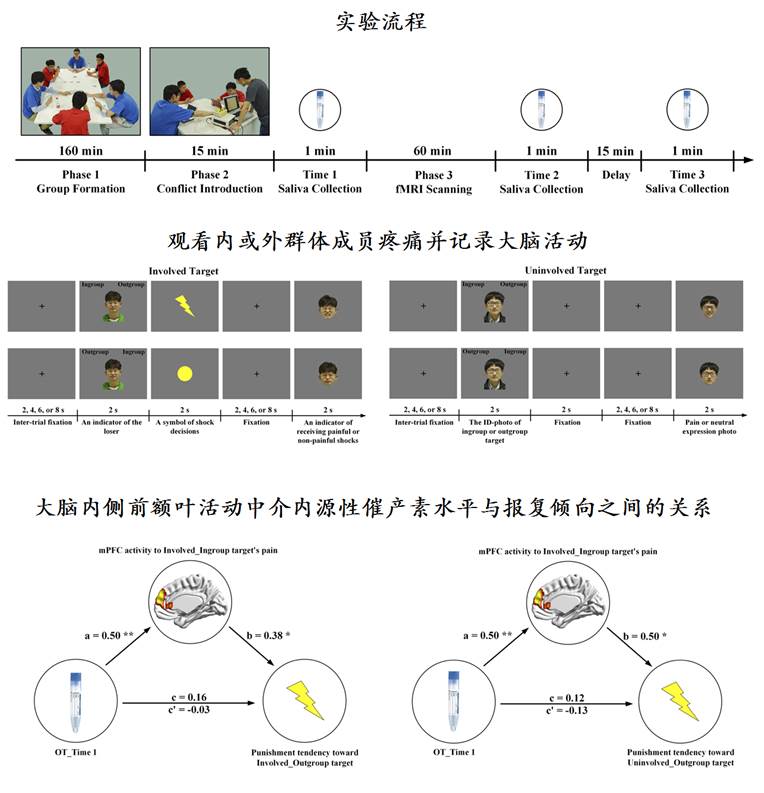 该研究设计了新的可以在脑功能成像实验室进行的群体冲突实验范式,招募人类被试在实验室中形成两个群体,并且诱发群体冲突。实验中测量(1)个体在观看内群体成员遭受外群体成员伤害时的大脑活动;(2)冲突过程中唾液催产素水平变化;(3)对外群体成员的报复倾向。研究中设计了严格的对照实验组用来控制与复仇倾向相关但非必要的心理活动,实验关键变量是内群体成员遭受的伤害是来自于外群体成员(实验组),还是来自于电脑的随机决定(控制组)。实验发现,与控制组相比,实验组的唾液催产素水平在冲突早期开始上升,并且在冲突过程中持续升高。唾液催产素水平可以预测个体在观看内群体成员遭受外群体伤害时的内侧前额叶活动,而内测前额叶活动可以进一步预测个体选择的对外群体成员电击惩罚的强度,并且这种预测对是否直接参与群体冲突的外群体成员类似。这提示从内源性催产素升高到内侧前额叶这一神经生物学通路,可能是一种群体冲突蔓延的神经生物学机制。这些研究结果对理解人类报复行为有重要启示。该研究工作受国家自然科学基金“中以合作项目”和“创新团队项目”支持。
