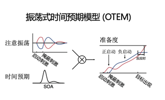 论文作者提出了振荡式时间预期模型(Oscillated Temporal Expectation Model,简称OTEM),试图用一个统合的机制去解释各种启动效应及其时间动态特性。模型假设,启动刺激出现后,大脑会为即将出现的目标积极进行准备。一方面,启动刺激会引发大脑的注意振荡,使得相关特征的注意增益随着时间而发生周期性的变化;另一方面,目标刺激出现的时间规律影响着大脑对未来目标的时间预期,决定着时间增益。最终,注意增益和时间增益的共同作用决定了大脑在目标出现出对目标的准备程度,准备程度越高则反应时越短。虽然模型假定大脑对相关特征从未有过持久的激活或抑制,注意振荡在不同特征上的相位差会给与启动刺激相似的目标刺激带来先发优势或劣势,使得模型可以产生出持久的正启动或负启动效应。