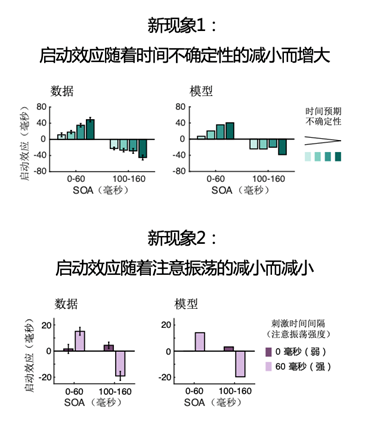 OTEM模型不但为前人文献中经典的正启动效应、负启动效应和新近发现的振荡式启动效应及其时间动态特性提供了统一的量化的解释,而且预测,启动效应会随着时间预期或注意振荡的变化而变化。在两个新实验中,论文作者分别操纵了时间预期和注意振荡,发现了符合模型预期的新现象——当时间不确定性降低时,启动效应会增大;当注意振荡减弱时,启动效应会减小甚至消失。