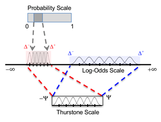 受到视知觉系统编码策略的启发,文中提出,大脑可能是以类似的策略用有限的认知资源实现概率信息的有效编码,而概率扭曲是编码和解码过程的副产品。具体而言,认知资源的有限性决定了编码范围和编码精度之间存在着此消彼长的关系(示意图[文中图1b]如下);选择适宜于当前环境的编码范围将有助于概率信息在大脑中的表征。基于此设想,文中提出了概率扭曲的有界对数赔率模型(Bounded Log-Odds Model,简称BLO),并使用前人数据集和新的实验对模型进行了实证检验。