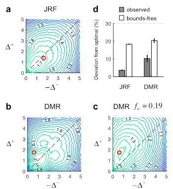 在概率判断(简称JRF)和风险决策(简称DMR)这两种不同的认知任务中,BLO对人们的行为数据的拟合都优于先前文献中的已知模型。并且,同一个体用于表征概率信息的认知资源数量在两种任务之间也存在着相关。不仅如此,在特定的认知资源限制下,人们在概率扭曲行为中实际表现出的概率编码范围接近于最大化客观概率值与内在表征之间的互信息(如下图[文中图5]所示),即,体现了有效编码原则。