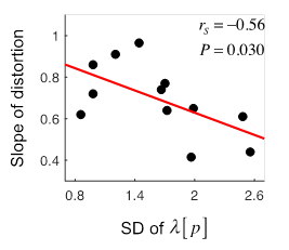 BLO也预测,概率扭曲函数会随着当前环境中概率值分布的不同而不同。文中汇总了前人文献中12项风险决策的实验研究的结果,发现正如BLO所预测,实验中采用的概率值的变异性越大,概率扭曲的斜率会越小(如下图[文中图7a]所示)。
