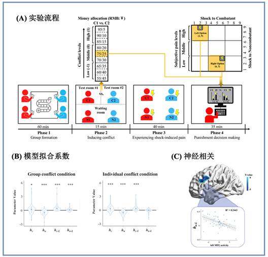 该研究设计了新范式模拟群际冲突中惩罚外群体的决策造成对平民的附带伤害。实验包含四个阶段(见图A)。第一阶段招募四名同性别互不认识的被试随机分为两组,并通过组队玩桌游建立群体认同感。第一阶段结束后,被试报告对内群体成员的亲近感显著高于对外群体成员。第二阶段随机选择每组一名被试作为士兵角色(即C1和C2),另外一名被试作为平民角色(即N1和N2)。两名士兵需要分割有限的资源,即分享一定数额的金钱,金钱分配不公平程度定义冲突水平。两名平民不参与金钱分割任务,因此没有卷入冲突。第三阶段四名被试体验从轻微(1级)到非常疼痛(9级)的电击水平,形成直观感受,并将在下一阶段使用不同电击水平惩罚外群体成员。第四阶段,被试观看外群体士兵给内群体士兵分配的金钱数额,根据不公平程度选择给外群体士兵一定程度的电击惩罚,同时每个惩罚会伴随给外群体平民一定程度的电击伤害。被试需要完成108个试次的决策。每个试次呈现的金钱分配方案会变化,同时提供给被试两个选项的电击水平也会变化。每个选项中包含一个给外群体士兵的惩罚电击强度(Sc)和一个给外群体平民的附带伤害电击强度(Sn),两种电击强度在不同试次中独立变化。通过记录被试在所有试次的决策,运用逻辑回归模型进行拟合,最后通过模型比较得到最优模型。最优模型中自变量包括给外群体士兵的电击强度在左右两个选项中的差值(ΔSc)、给外群体平民的电击强度在左右两个选项中的差值(ΔSn)以及冲突水平(L),因变量为被试在不同试次中选择左边选项的概率(p)或者右边选项的概率(1-p):