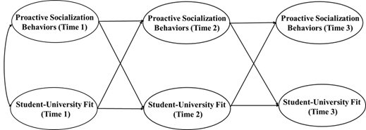 Note. Structural equation model to test the reciprocal relationships between proactive socialization behaviors and perceived student-university fit. The figure shows only latent constructs, and omits observed variables and within-wave correlations of residual variances.