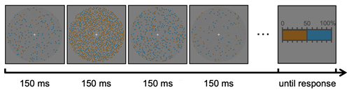 被试的任务是追踪快速呈现于屏幕上的青色和橘色点阵序列,并在序列突然停止后报告最后一屏刺激中青色或者橘色点占两种点总数的相对频率(如图1所示)。每屏刺激中的相对频率记为p;经推导,p在表征上的不确定性(representational uncertainty)的数学形式与p(1–p)成正比[2][3]。统计上,p和p(1–p)是线性独立的。