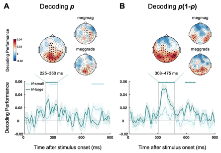 研究者们采用了一种巧妙的刺激序列设计来分离p和p(1–p)对神经活动的影响。在一半的刺激序列中,p呈周期性变化而p(1–p)呈非周期性变化;在另一半的刺激序列中,p(1–p)呈周期性变化而p呈非周期性变化。研究者们分析了刺激序列中的周期性变量与MEG信号之间的相位一致性,也使用MEG信号对刺激序列中的非周期性变量进行了解码分析。这两种分析的结果相互印证,都表明大脑不仅编码了任务中所要求追踪的相对频率信息(p),还自动编码了看似与任务无关的变量——表征上的不确定性(p(1–p))。如图2所示,虽然从地形图来看,二者在MEG信号中的编码位于相似的枕叶和顶叶区域,但是从时程来看,相对频率的编码发生在刺激呈现后约300 ms,而表征上不确定性的编码发生在约400 ms,比前者晚约100 ms。
