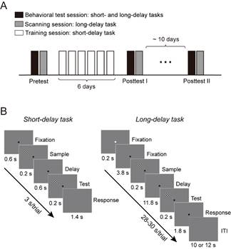 在本研究的两个实验中,李晟课题组分别结合了知觉训练与功能磁共振成像(fMRI)和经颅磁刺激(TMS)技术,对以上问题进行了探讨。在训练阶段中,被试需要经过为期6天的朝向辨别任务训练(图1),即判断第二个测试刺激相对于第一个记忆刺激的朝向偏转方向。在前后测阶段,研究者结合fMRI和TMS技术考察工作记忆相关脑区(初级视皮层和顶内沟)在两个刺激间延迟阶段的神经活动模式。