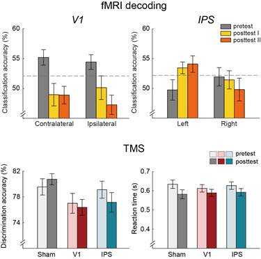 在训练前后,实验一结合fMRI和多体素模式分析(MVPA),解码被试在两个刺激间延迟阶段对朝向信息的记忆表征。结果发现,初级视皮层的神经活动仅在训练前可以解码记忆朝向,而顶内沟的神经活动仅在训练后可以解码记忆朝向。实验二使用fMRI引导下的在线重复TMS技术,分别干扰初级视皮层和顶内沟在延迟阶段的神经活动。结果发现,干扰初级视皮层的神经活动在训练前后都有损被试的行为表现;而干扰顶内沟的神经活动仅在训练后降低被试的行为表现。